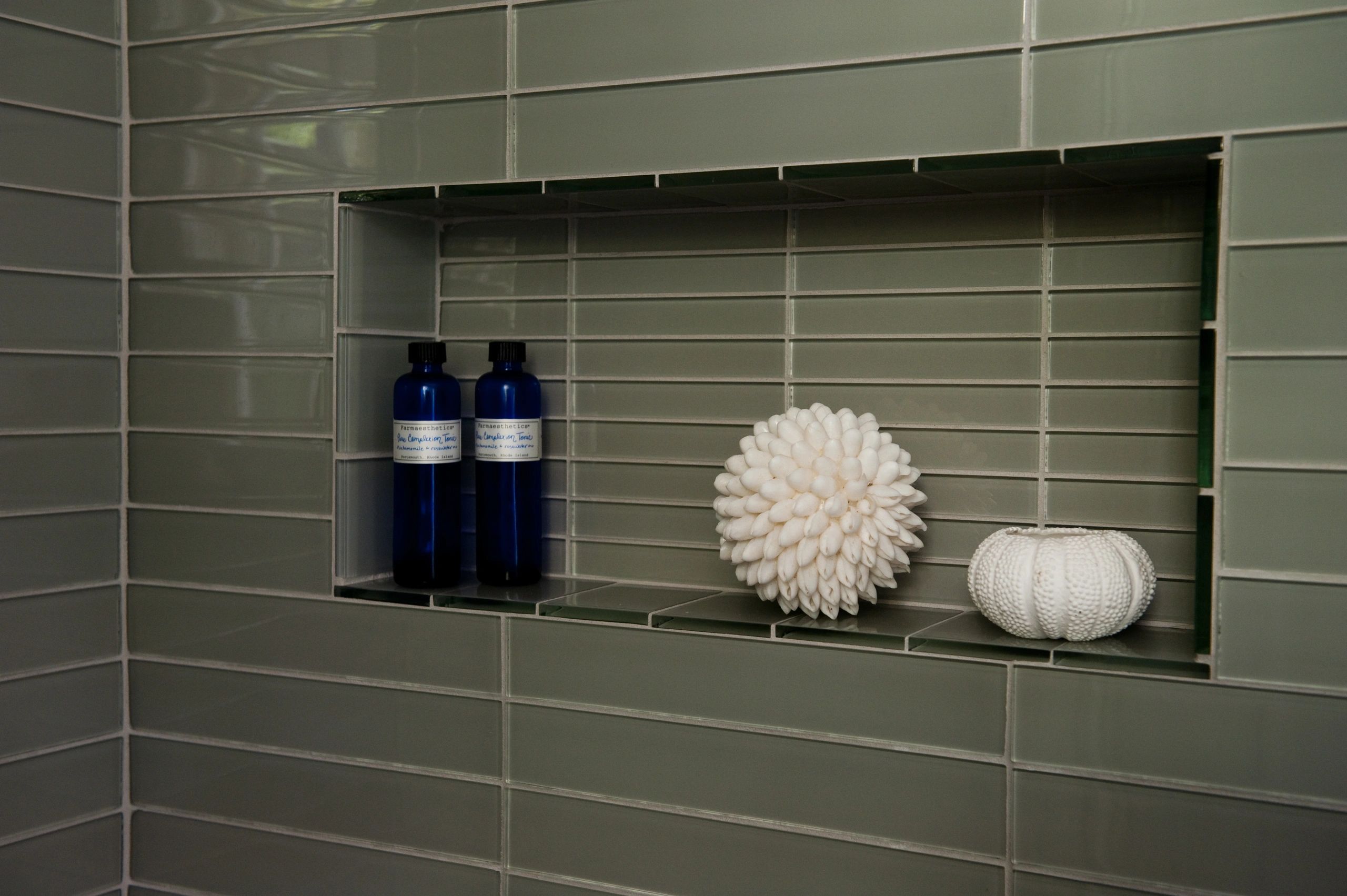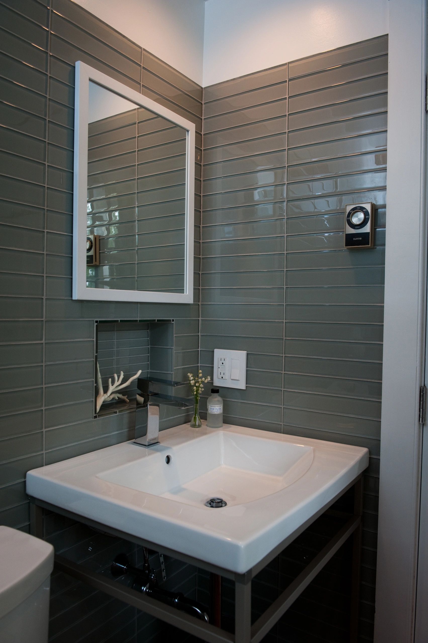 The bathroom is very tiny. Using glass walls and mirrored doors created the illusion of spaciousness. Adding niches in the shower and above the vanity and using an open based vanity also achieved the spacious feeling.