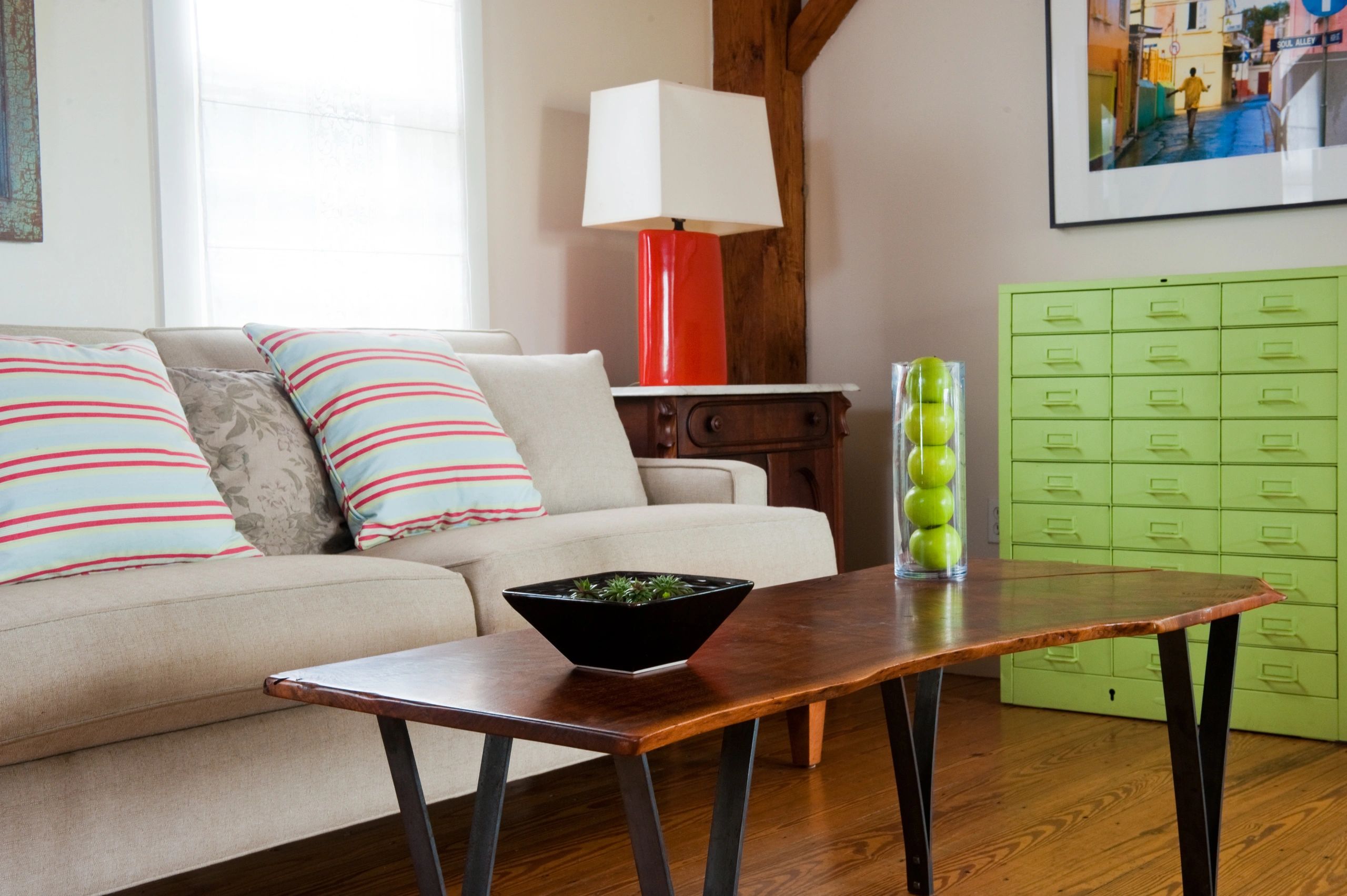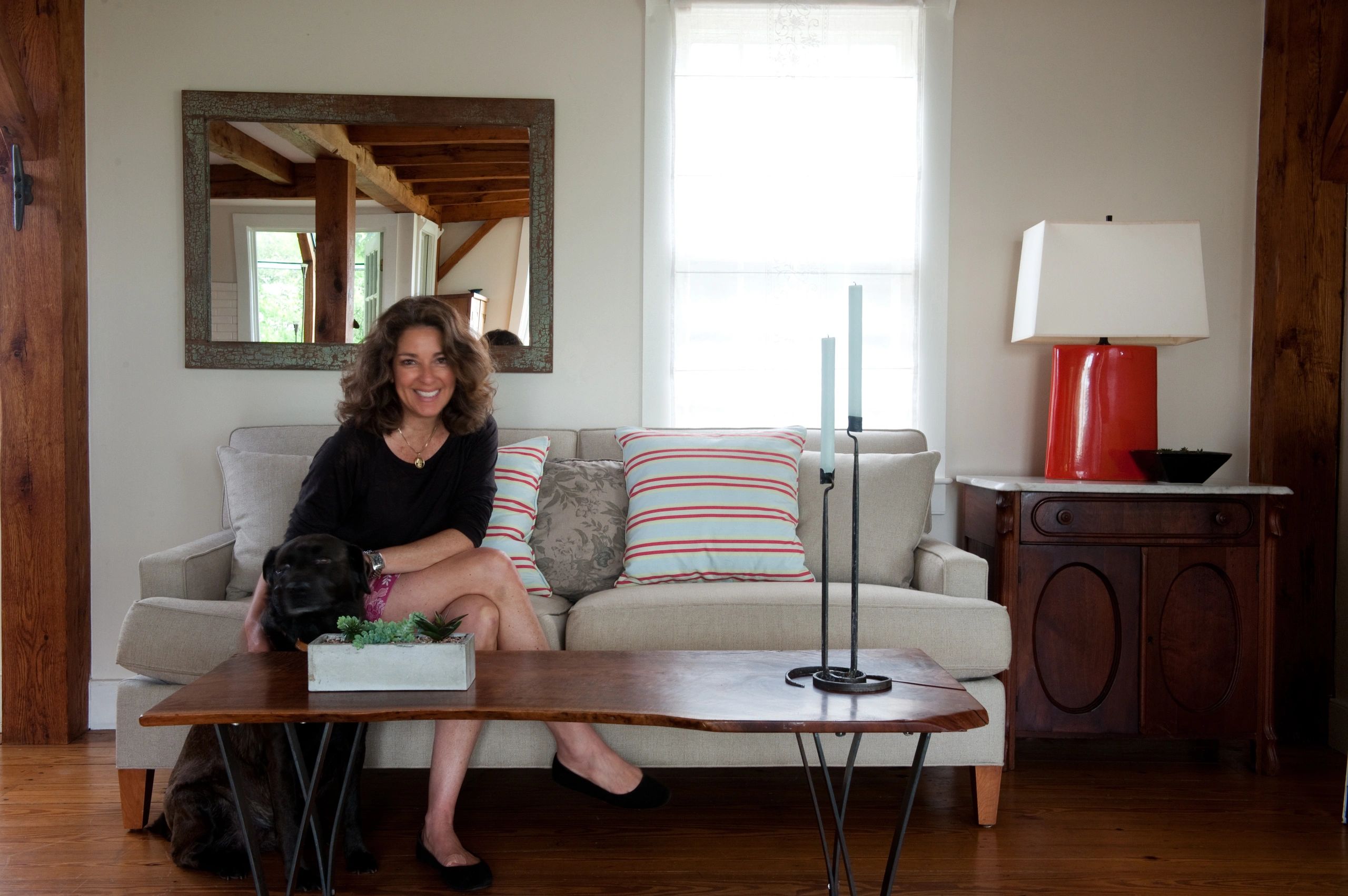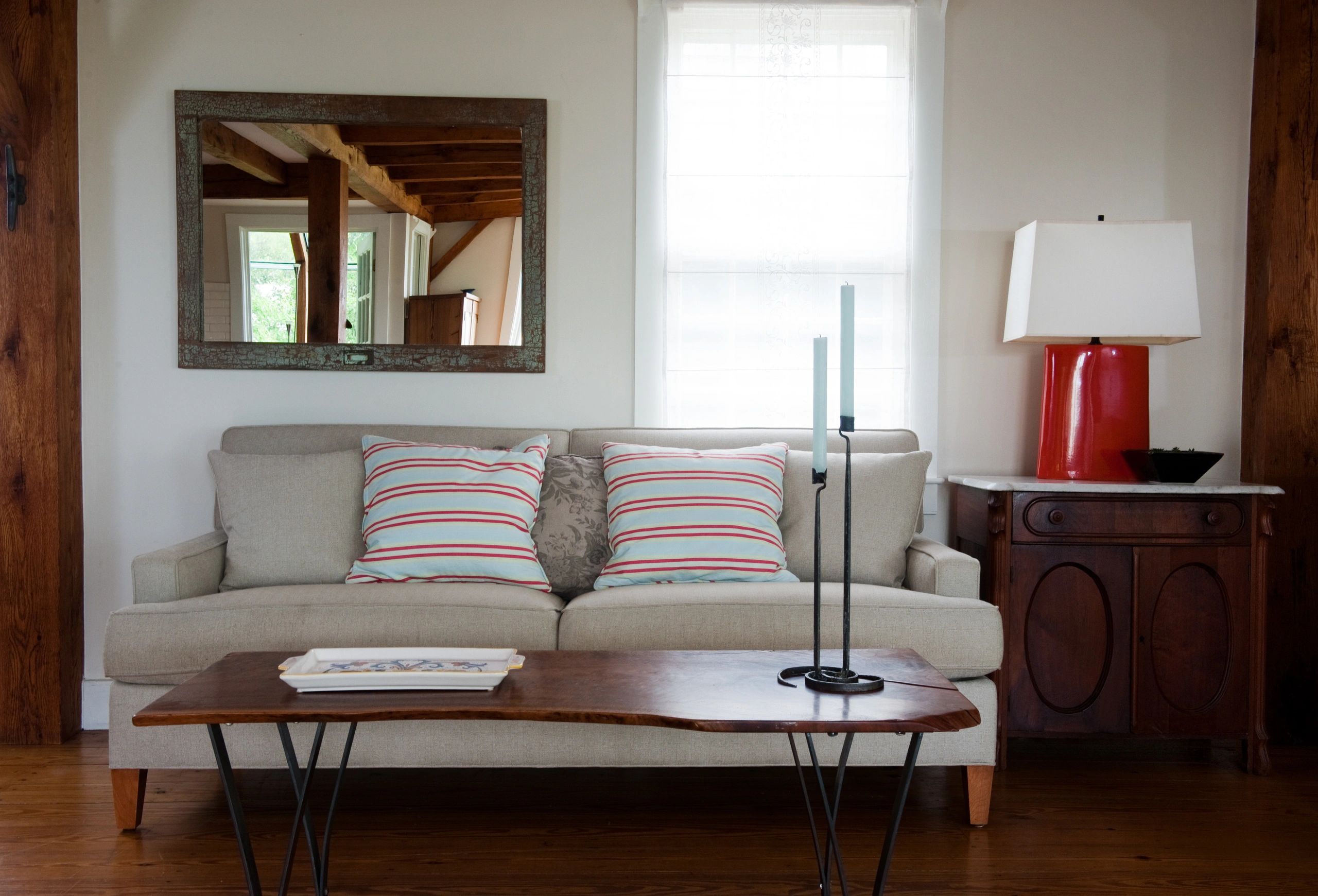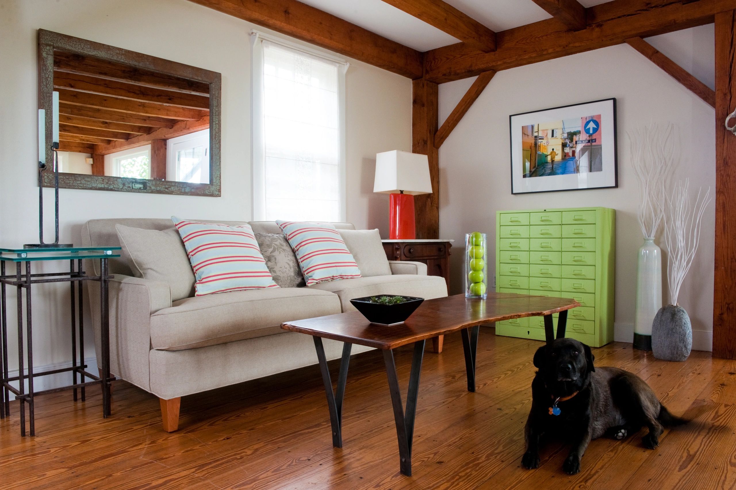 In the living room, the line of the furniture and fabrics mimic the lines of the post & beam.