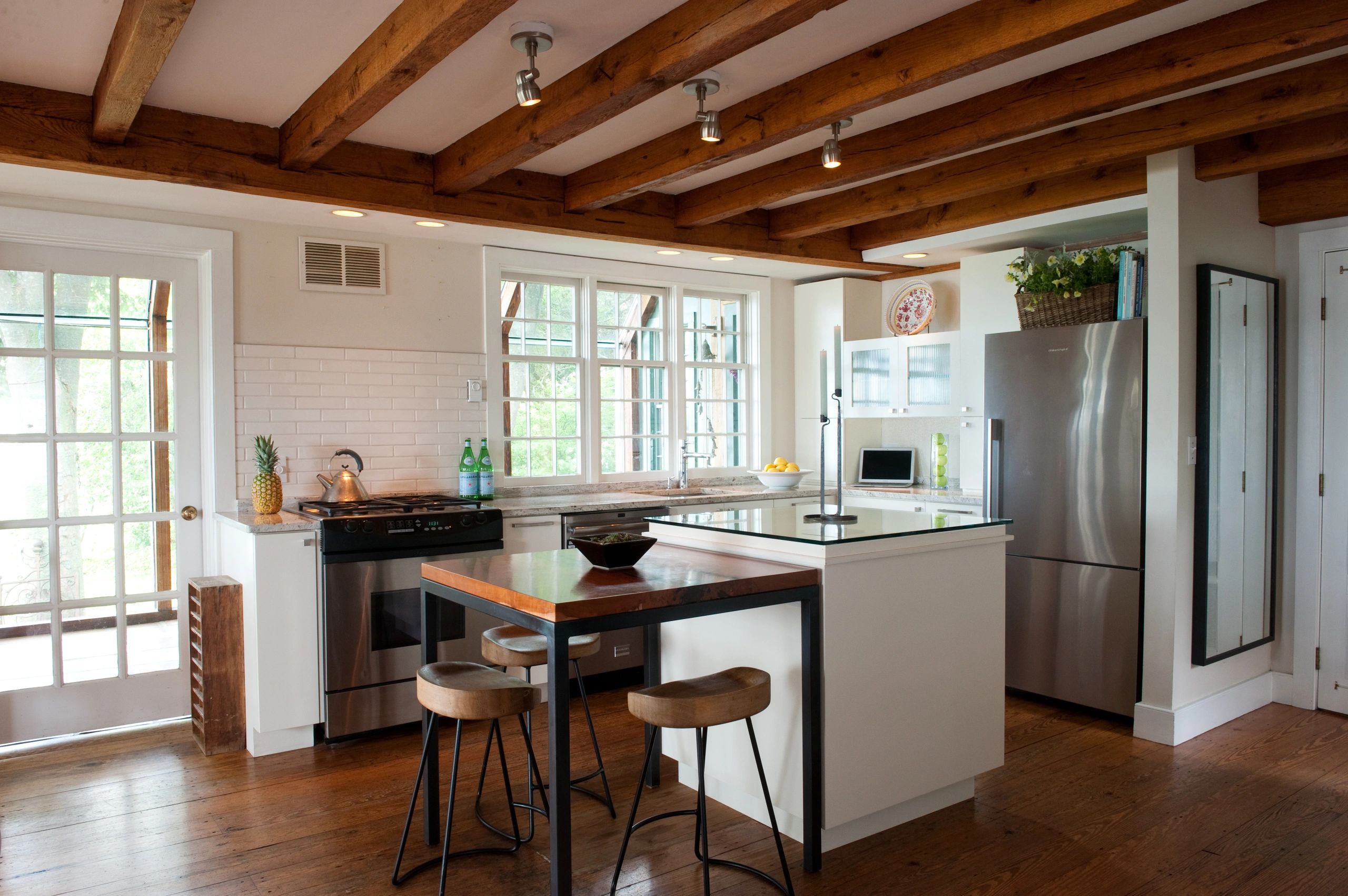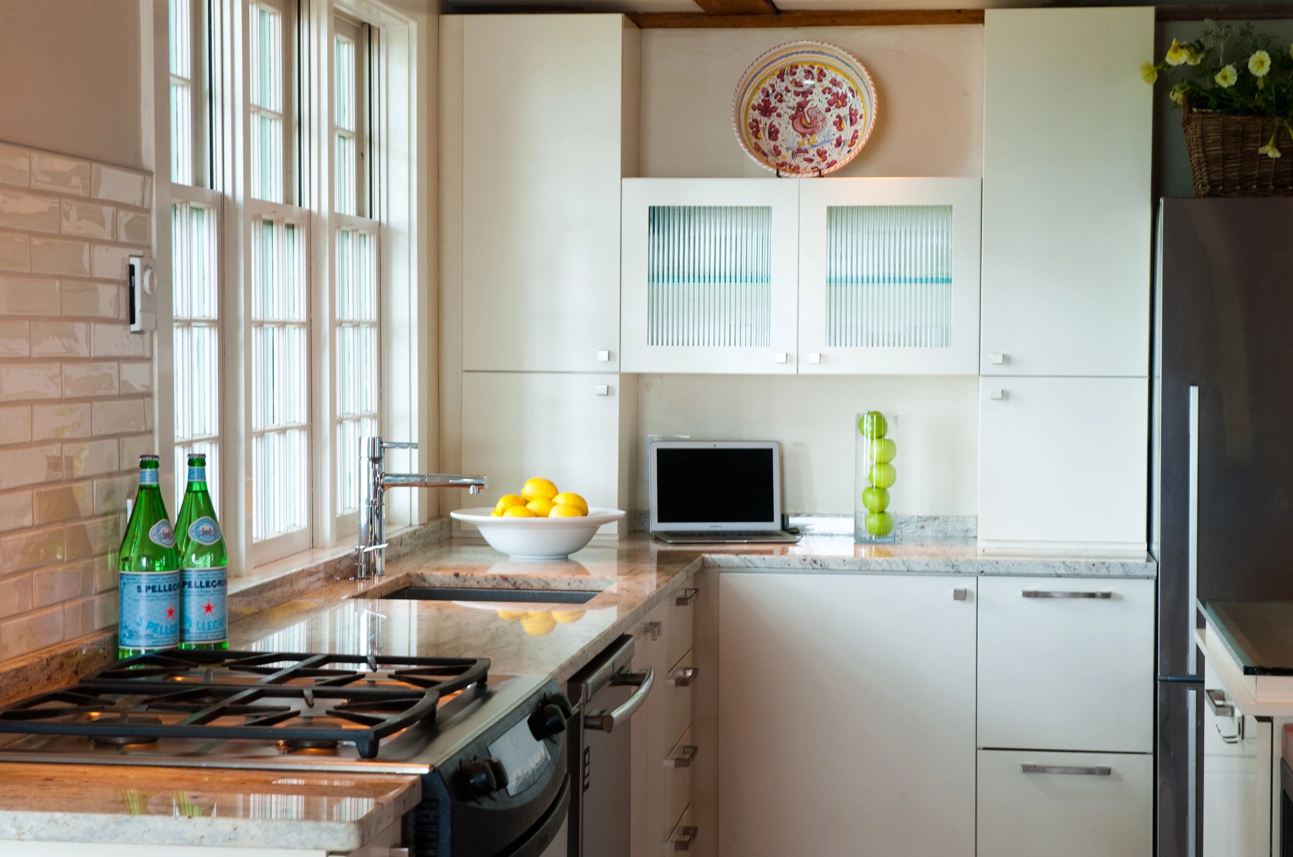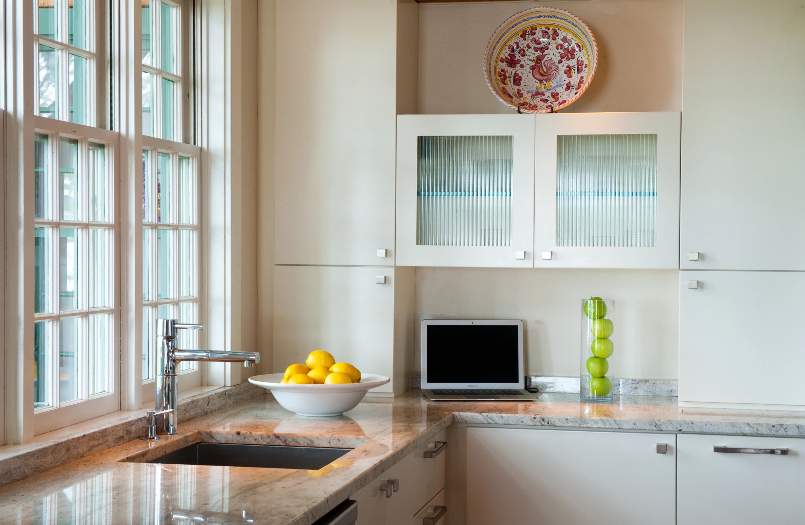 The kitchen cabinetry was designed specifically to feature the Deruta bowl. The two piece island allows versatility. The freestanding piece can be moved in front of the wood stove for fireside dining. The pieces can be separated for different stations at parties.